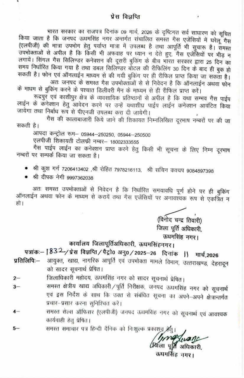 View Allउधमसिंह नगर में घरेलू गैस की पर्याप्त उपलब्धता, उपभोक्ताओं से अफवाहों पर ध्यान न देने की अपील