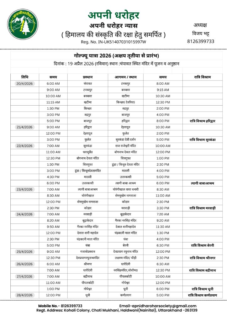 उत्तराखंड की समृद्ध सांस्कृतिक विरासत और आस्था का प्रतीक गोल्ज्यू महाराज यात्रा 2026 इस वर्ष 19 अप्रैल (रविवार) को अक्षय तृतीया के पावन अवसर पर चंपावत स्थित मंदिर में विधिवत पूजा-अर्चना एवं अनुष्ठान के साथ प्रारंभ होगी। यह भव्य धार्मिक यात्रा 21 दिनों तक विभिन्न प्रमुख तीर्थ स्थलों से होकर गुजरते हुए 9 मई 2026 को पुनः चंपावत में समापन होगी।